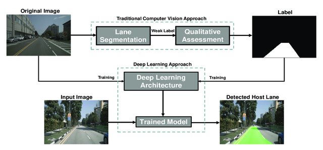 Automatic lane detection is a classical task in autonomous vehicles that traditional computer vision techniques can perform. However, such techniques lack reliability for achieving high accuracy while maintaining adequate time complexity in the context of real-time detection in complex and dynamic road scenes. Deep neural networks have proved their ability to achieve competing accuracy and time complexity while training them on manually labeled data. Yet, the unavailability of segmentation masks for host lanes in harsh road environments hinders fully supervised methods’ operability on such a
