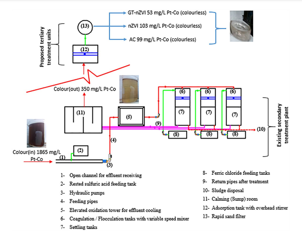 Daily, a big extent of colored, partially treated textile effluents drained into the sanitation systems causing serious environmental concerns. Therefore, the decolorization treatment process of wastewater is crucial to improve effluent quality. In the present study, 3 different sorbent materials, nano zerovalent iron (nZVI), activated carbon (AC), and green-synthesized nano zerovalent iron (GT-nZVI), have been prepared for raw textile wastewater decolourization. The prepared nanomaterials were characterized via X-ray diffraction (XRD) spectroscopy, scanning electron microscopy (SEM), energy