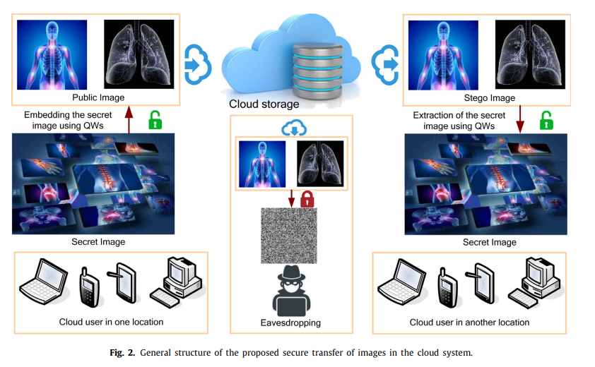 Secret images transfer in cloud system based on investigating quantum walks in steganography approaches
