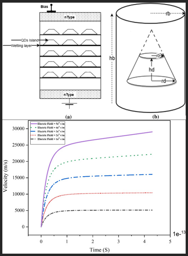 In the present paper, a theoretical model for calculating the carrier mobility which is a result of the existence of a truncated conical quantum dots of n-type quantum dot infrared photodetectors (QDIPs) is developed. This model is built on solving Boltzmann’s transport equation that is a complex integro-differential equation describing the carrier transport. The time-domain finite-difference method is used in this numerical solution. The influences of dimensions and density of the QDs for this structure on the carrier mobility are studied. Eventually, the calculated mobility for truncated