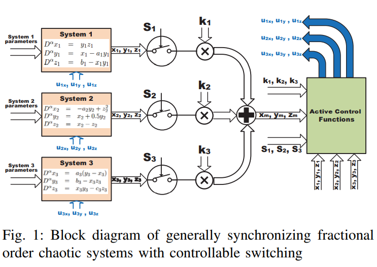 This paper discusses the continuous effect of fractional order parameter on two chaotic systems. Switched synchronization of three different fractional order chaotic systems is presented as an extension for synchronizing two different systems using active control. The proposed technique, which is based on the switching parameters and the scaling factors that control the choices of master and slave systems, is explained. The NonStandard Finite Difference method is used for the numerical solution of the fractional order master and slave systems. Four cases and many numeric simulations are