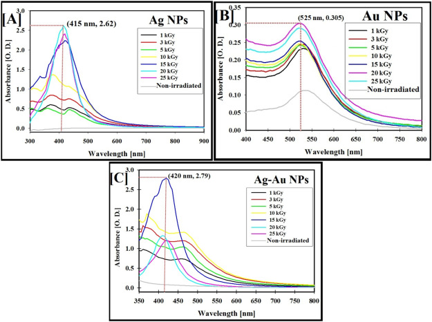 In this research, irradiation by gamma rays was employed as an eco-friendly route for the construction of bimetallic silver-gold nanoparticles (Ag-Au NPs), while Gum Arabic polymer was used as a capping agent. Ag-Au NPs were characterized through UV–Vis., XRD, EDX, HR-TEM, FTIR, SEM/mapping and EDX analysis. Antibiofilm and antimicrobial activities were examined against some bacteria and Candida sp. isolates from diabetic foot patients. Our results revealed that the synthesis of Ag-Au NPs depended on the concentrations of tetra-chloroauric acid and silver nitrate. HR-TEM analysis confirmed the