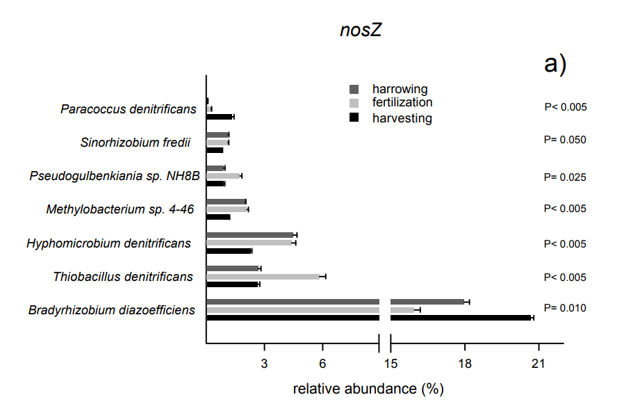 N2O is a major greenhouse gas and the majority of anthropogenic N2O emissions originate from agriculturally managed soils. Therefore, developing N2O mitigation strategies is a key challenge for the agricultural sector and biochar soil treatment is one reported option. Biochar's capacity to increase soil pH and to foster activity of specialized N2O reducers has been proposed as possible mechanisms for N2O mitigation. An experiment was undertaken to investigate whether changes in the community composition of N2O reducers was observed under field conditions after biochar application. The study