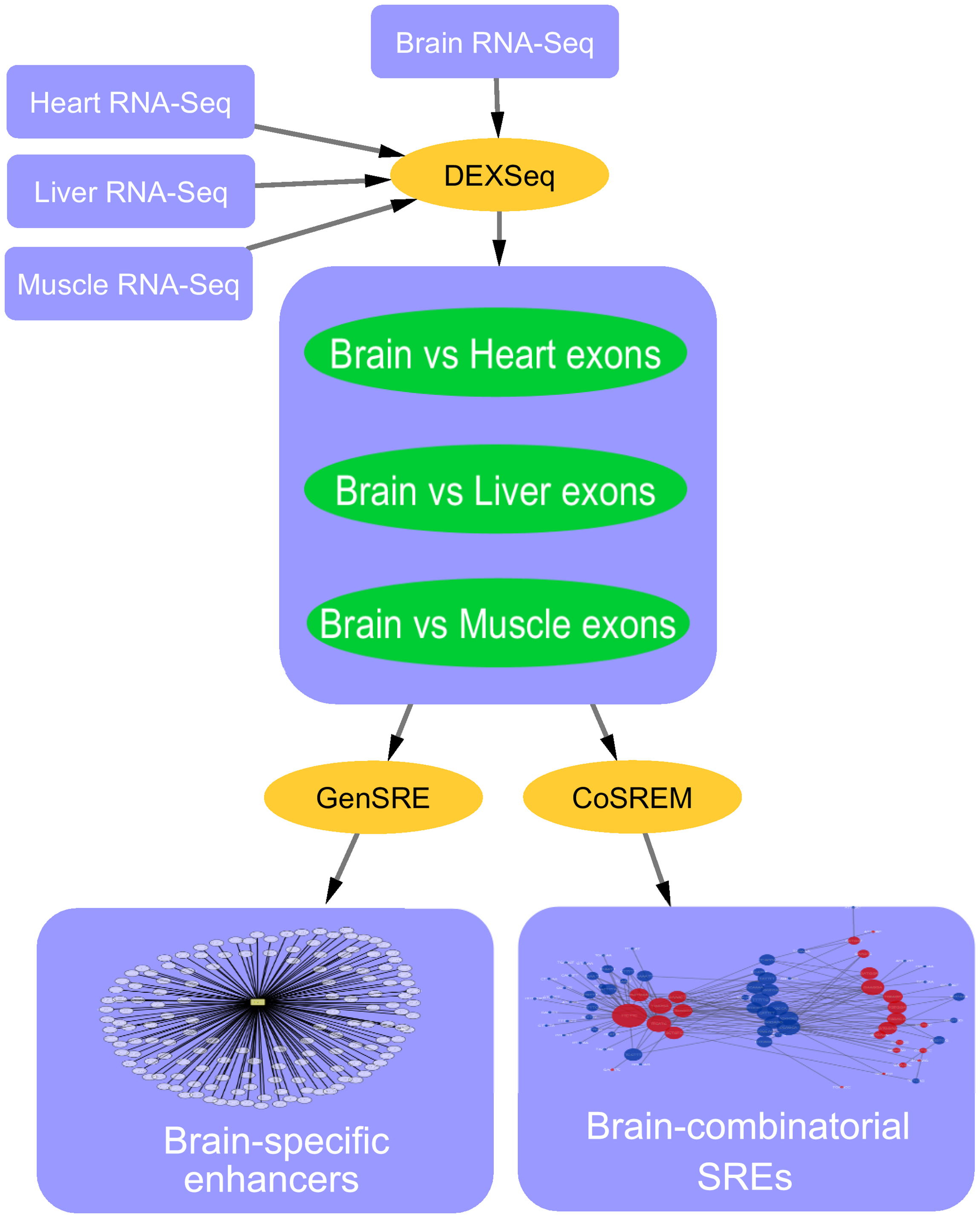 Alternative splicing is a vital process for regulating gene expression and promoting proteomic diversity. It plays a key role in tissue-specific expressed genes. This specificity is mainly regulated by splicing factors that bind to specific sequences called splicing regulatory elements (SREs). Here, we report a genome-wide analysis to study alternative splicing on multiple tissues, including brain, heart, liver, and muscle. We propose a pipeline to identify differential exons across tissues and hence tissue-specific SREs. In our pipeline, we utilize the DEXSeq package along with our previously