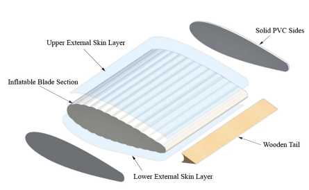Inflatable structures are characterized by being light and easy to manufacture and deploy. Hence, they find many applications in aerospace and aeronautical engineering. In this paper, an inflatable segment with a The National Advisory Committee for Aeronautics (NACA) 0021 airfoil cross-section is designed, fabricated, and tested. The geometrical accuracy of the manufactured inflatable segment is measured using laser scanning. Measurements show that the average normalized error of the chord length and thickness are 2.97% and 0.554%, respectively. The aerodynamic behavior of the inflatable