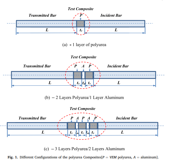 A comprehensive theoretical and experimental investigation is presented of the behavior of polyurea composites subjected to high strain-rate impact loading. The composites under consideration consist of an assembly of steel sections and inserts manufactured from layers of polyurea or polyurea augmented with aluminum layers (AL). A finite element model (FEM) is developed to predict the dynamics of this class of polyurea composites by integrating the dynamics of the solid steel sections with those of polyurea using the Golla-Hughes-Mctavish (GHM) mini-oscillator approach. The predictions of the