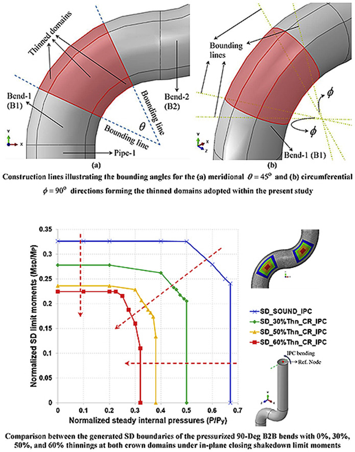 The present research focuses on generating interaction diagrams (i.e. limit moment boundaries vs steady internal pressure spectra) of pressurized 90 o miter and smooth bends. One-, two-, three-, and four-weld miter bends are modelled and analyzed. Additionally, 90 o smooth bends (SBs) bearing the miter bends’ same material and major geometric parameters are analyzed thus providing broader range of comparisons concerning structural responses to external applied loadings. All bends analyzed are subjected to steady internal pressure spectra and monotonic in-plane closing, in-plane opening, and