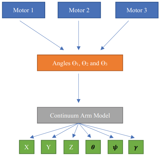 Continuum robotic arm becomes the new area of scientific research nowadays. Its technology has grown and touched several vital applications included industry and agriculture thanks to many advantages made it a better choice than the conventional serial robotic manipulator. This paper represents a new designed model of continuum arm robot, which relates the motor shaft angle as the input parameter and transfers the motor torque to combined system of compression springs and results in six outputs: x,y and z 3D coordinates for the center point of the end effector and \theta,~\psi and \gamma to